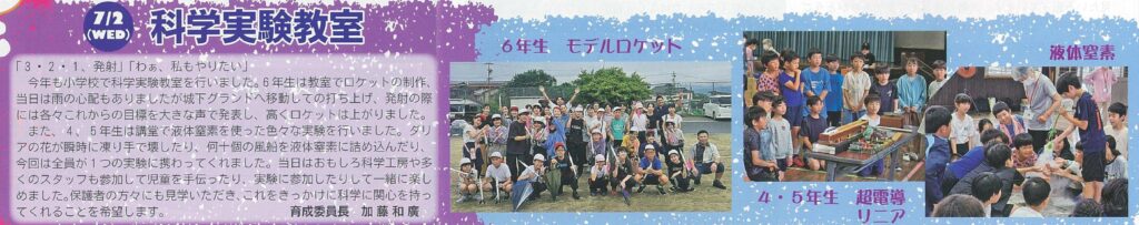 ホームお知らせ 館報橋南 科学実験教室 2025年9月1日 2025年10月12日 SHARE ポスト シェア はてブ LINE 2025年7月2日 追手町小学校で科学実験教室を行いました 今年度から6年生は、モデルロケットを作って打ち上げ 4・5年生は合同で超低温の不思議世界&リニアの実験を行いました