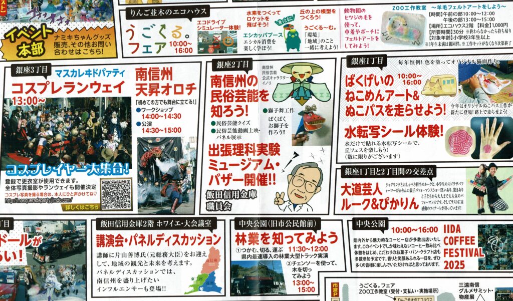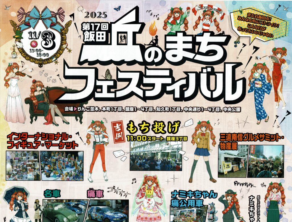 2025年11月3日 第17回飯田丘のまちフェスティバルが行われました。飯田市の中心市街地でアニメキャラクターなどを描いた痛車!!コスプレ!! 29団体が集まりました。雨が時々 パラパラと降りましたが、大盛況でどこのコーナ―も大勢の人だかりが出来ていました。