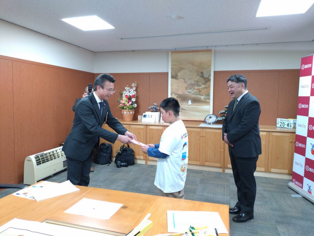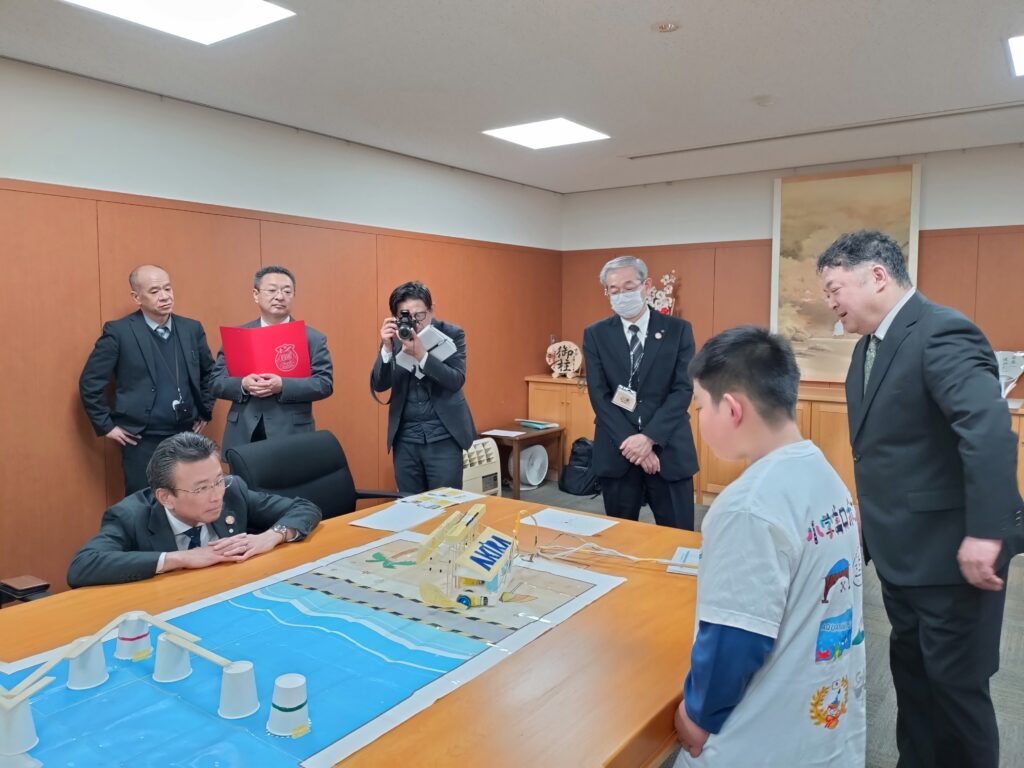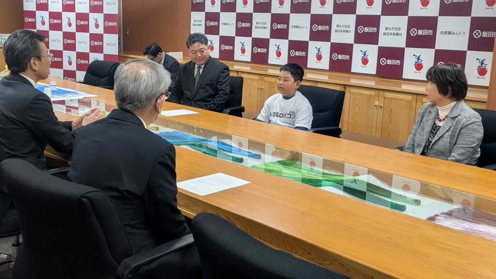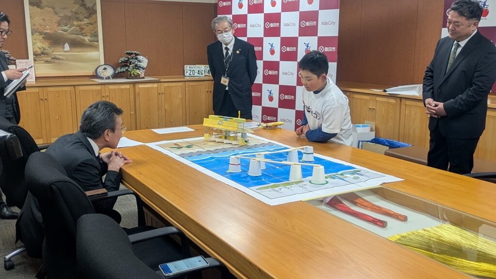 3月3日 佐藤飯田市長 熊谷教育長に表敬訪問をしてきました。市長さんから「動かしてみて」との言葉。コップを一度に4個運び、そのまま割りばしで橋を架けてきます。とてもスムーズに動きびっくりしていました。吉沢君からは「来年は一位になりたいと!!」力強い言葉がありました。