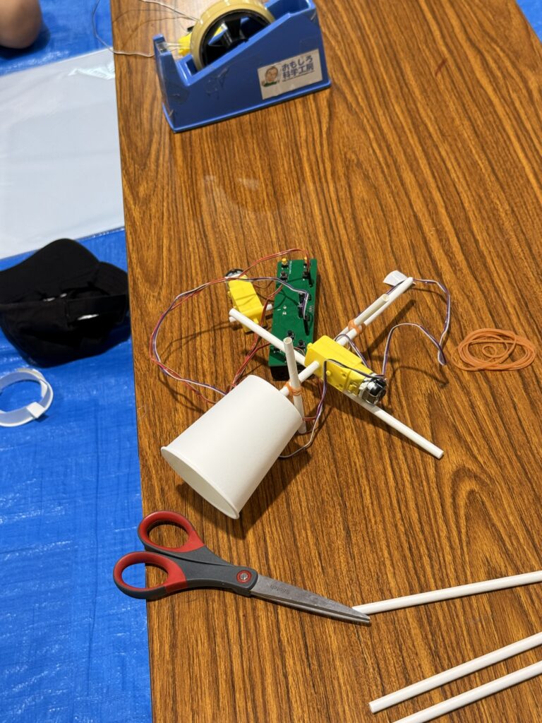 今年の競技は「ロボットを使ってコップに割りばしで橋を架ける」というもの 詳しくはおもしろ科学工房HP めざせ全国!小学生ロボコン工作教室